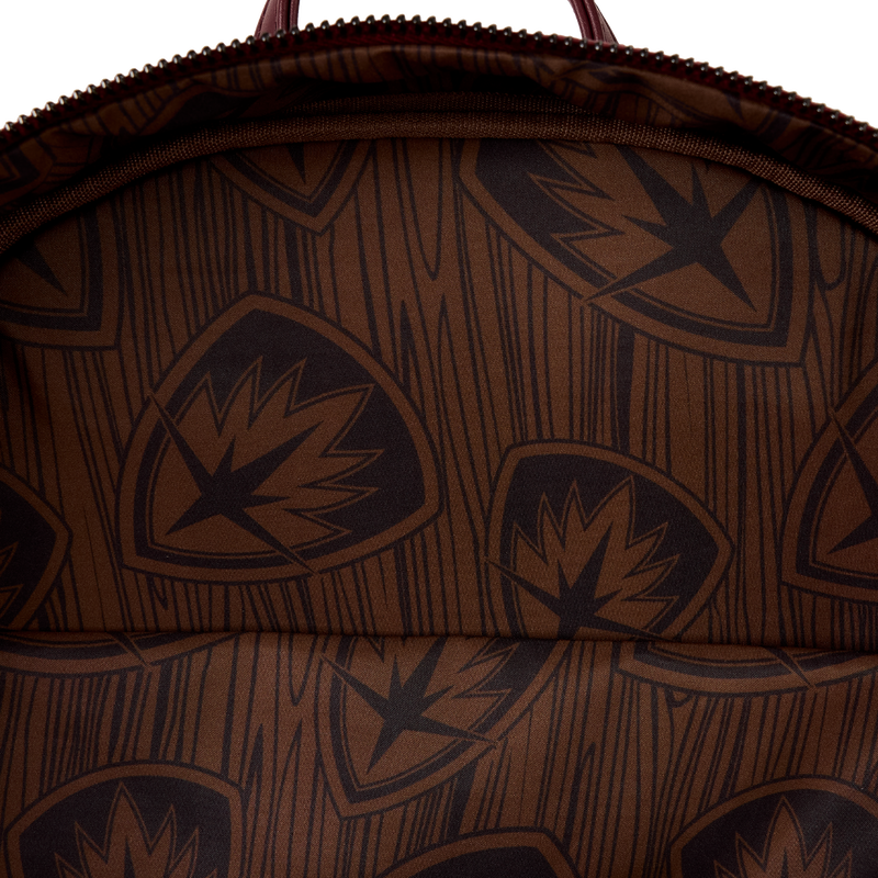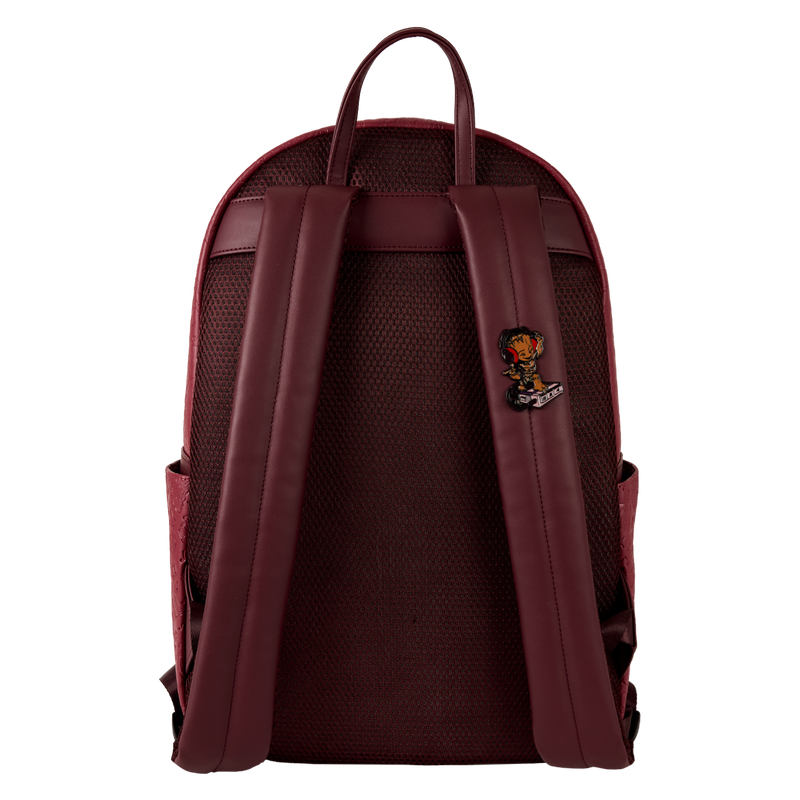 This backpack is inspired by Groot from Marvel’s Guardians of the Galaxy. The front pocket is in the shape of a cassette tape that’s labeled as “Awesome Mix Vol. 1.” The tape reels move on a spinning rivet! All over, you’ll find a debossed pattern of cassettes, Groot, music notes, and more! For another fun touch, you’ll find Groot on the zipper pull and an enamel pin of him on the strap!