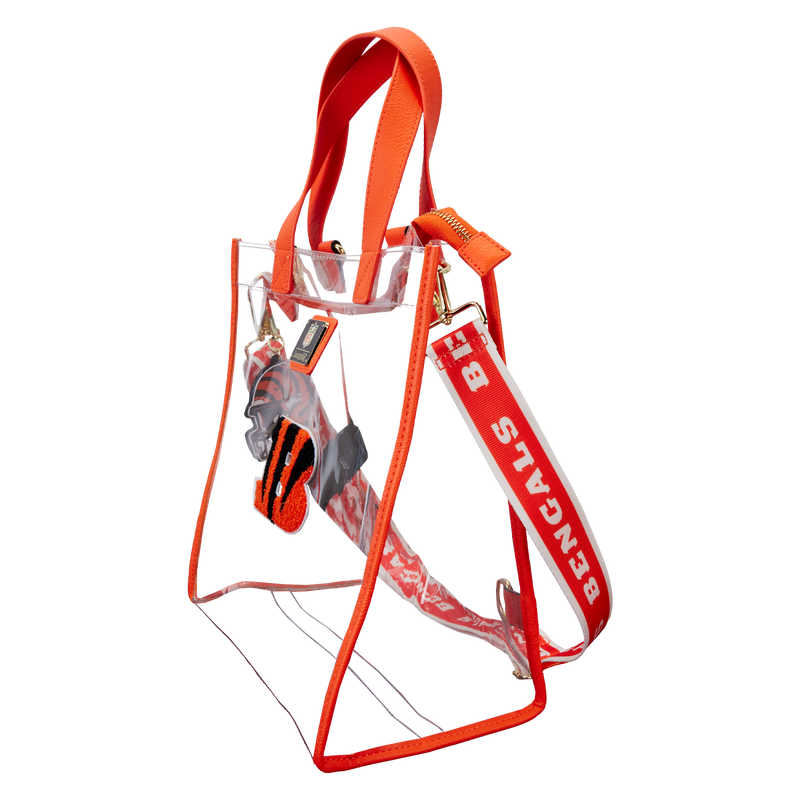 Feeling game-day ready? Cheer on your favorite football team with this convertible tote bag! The clear design makes it easy to bring your belongings into the stadium, and versatile shoulder straps help to keep your bag close as you wander the crowds. A chenille patch of the Bengals logo, a helmet-shaped bag charm, and coordinating team colors give this bag an elevated look. No need to sacrifice your style at the big game – this accessory is the perfect combination of fashion and function.