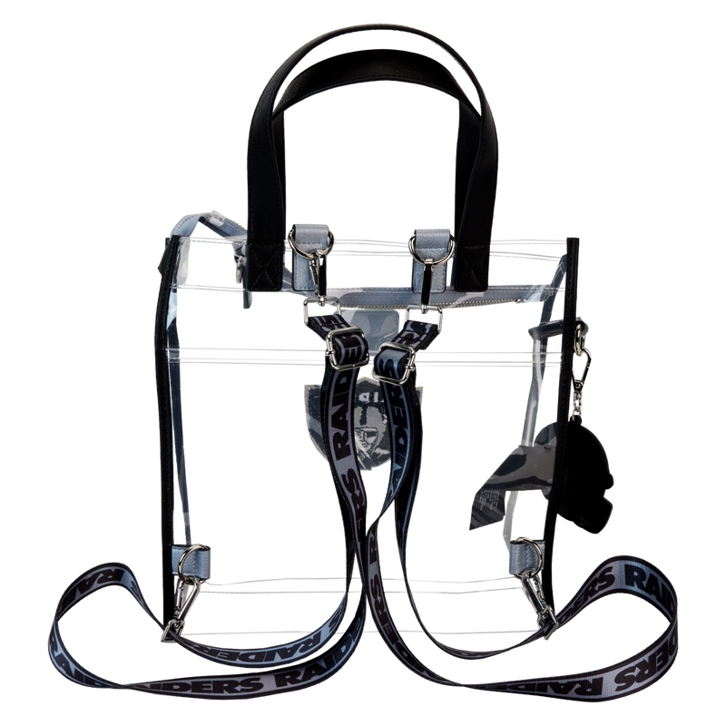 Feeling game-day ready? Cheer on your favorite football team with this convertible tote bag! The clear design makes it easy to bring your belongings into the stadium, and versatile shoulder straps help to keep your bag close as you wander the crowds. A chenille patch of the Raiders logo, a helmet-shaped bag charm, and coordinating team colors give this bag an elevated look. No need to sacrifice your style at the big game – this accessory is the perfect combination of fashion and function.