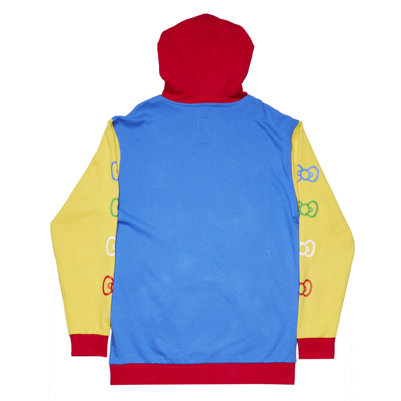 Fasten your bow and say hello in supercute style! Our Loungefly Sanrio Hello Kitty 50th Anniversary Unisex Hoodie is a great way to share smiles and your favorite fandom. Bright, bold color blocking adds a fun touch to this soft hoodie. Red, yellow, and blue colors add complementary contrasts for adorable prints that appear on the front and sleeves. Printed bows, in green, red, white, and blue line the sleeves, and the front pocket is shaped like a coin purse! The coin purse also features a colorful print of Hello Kitty with her fish and milk bottle with straw. Even the drawcord strings display her signature red bow as puff drawcord pulls.
